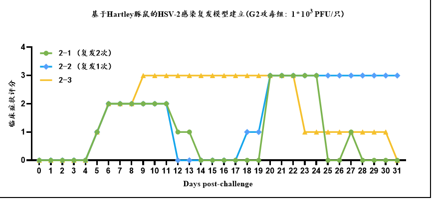 图4.基于Hartley豚鼠的HSV-2感染复发模型建立(G2攻毒组:1*10 PFU/只)
