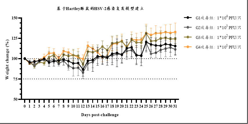 建立HSV-2复发模型的研究中,我司选用Hartley豚鼠进行实验。通过设置不同剂量攻毒组,观察到各组的病变表现及体重变化呈现明显差异,体现了模型良好的剂量反应关系。在为期31天的观察期内,已观察到编号为2-1的豚鼠发生2次复发,进一步验证了该模型可有效模拟人类HSV-2感染的复发现象。